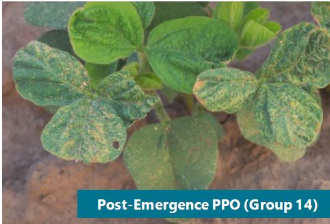 Figure 5. Dégâts causés au soya après l’application foliaire d’un herbicide à base de PPO. Les feuilles présentent un certain degré de déformation et de raccourcissement de la nervure médiane. Cela pourrait être confondu avec d’autres types de blessures. Cependant, elles présentent également une brûlure des feuilles exposées au moment de l’application, caractéristique des dommages causés par la PPO.