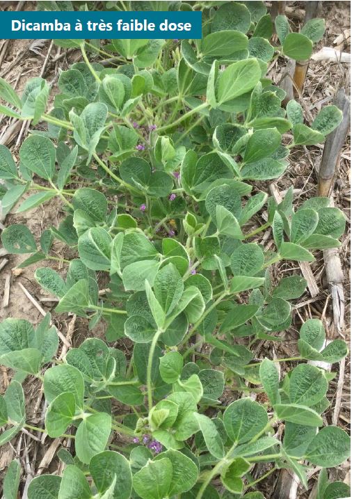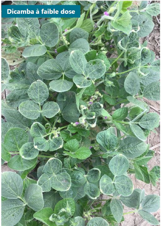 Figure 2. Plants de soya montrant un voilement des feuilles vers le haut, caractéristique des dommages causés par le dicamba. Les symptômes sont limités aux nouvelles pousses, les feuilles plus anciennes n’étant pas affectées.