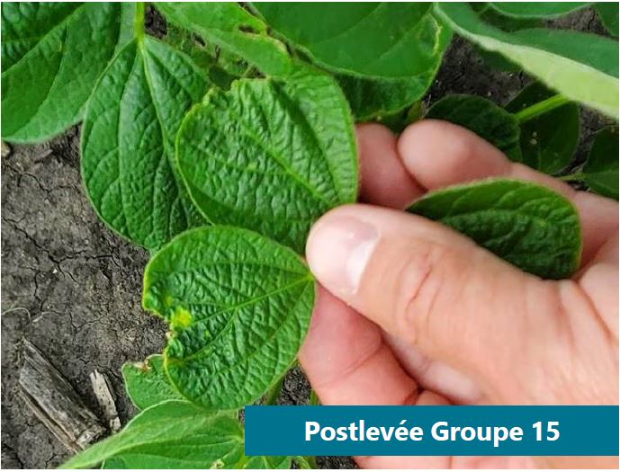Figure 6. Plants de soya présentant les symptômes caractéristiques des dommages causés par les herbicides du groupe 15. Les nervures médianes sont raccourcies, ce qui donne des folioles en forme de cœur.