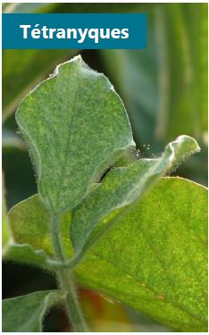 Figure 7. Voilement et pointillage des feuilles de soya causés par les tétranyques