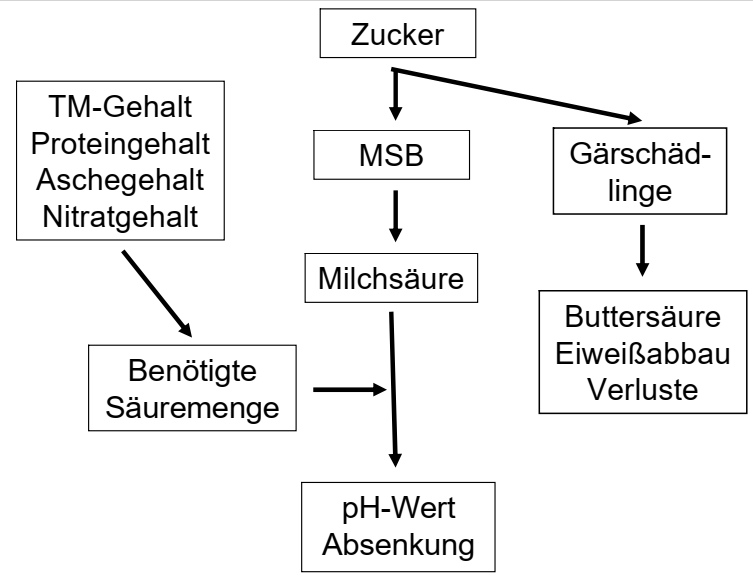 Ebenso können geringe Zucker- bzw. Milchsäurebakterien-Konzentrationen zu einer unzureichenden Fermentation führen. Auch hohe Rohasche-Gehalte (˃10 %) hemmen die Umsetzung von Zucker, sodass die Silierung unvollständig abläuft. Hohe Wassergehalte haben zwar keinen Einfluss auf den Gärprozess, können aber zu einer hohen Sickersaftbildung führen.