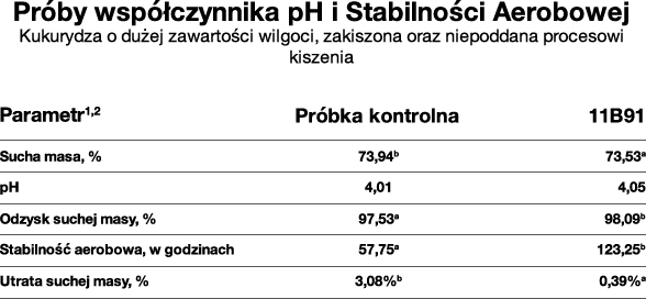 Źródło: Centrum Żywienia Zwierząt Gospodarskich marki Pioneer®, Iowa. Podsumowanie dwóch testów. Odzysk suchej masy, stabilność tlenową i skład odżywczy określono dla kiszonki niezakiszonej (kontrolnej) oraz dla kiszonki kukurydzianej zakiszonej (inokulowanej) preparatem 11B91 Corn Silage Inoculant (11B91) marki Pioneer®.
