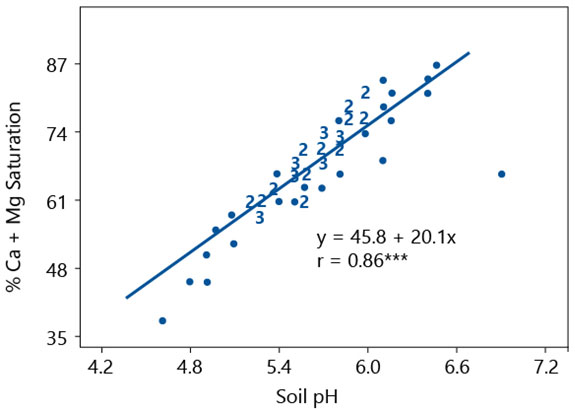 Current recommendations would suggest an application of agricultural or dolomitic lime to correct the pH. Besides raising the pH, the lime application would also move the BCSR away from the “ideal” ratio but actually improves crop production due to a more favorable pH.