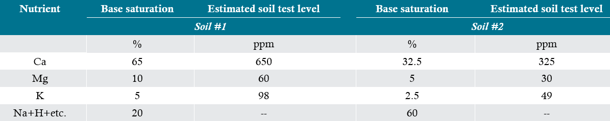 Table 2. Comparison of 2 soils with the same base saturations but different CEC and their approximate levels of calcium, magnesium, and potassium in the soil at the “ideal” ratio.