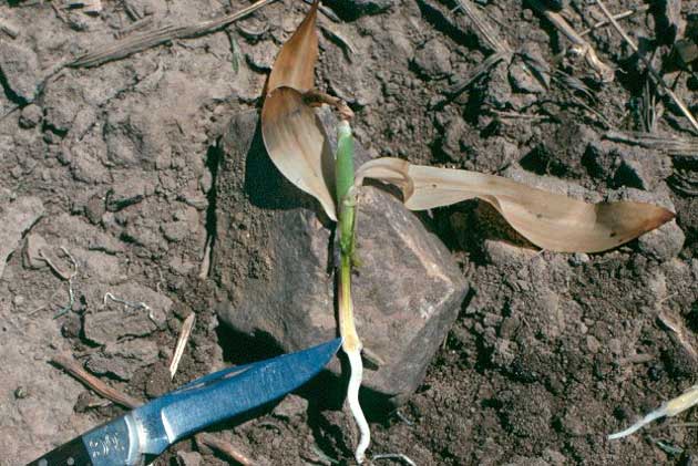 Figure 6. Corn seedling in same field and with similar level of damage as in Figure 4 and Figure 5, eight warm days after damage occurred.