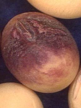 - Seeds are infected through their attachment to the pod. Infected seeds may show a pink to pale or dark purple discoloration.
