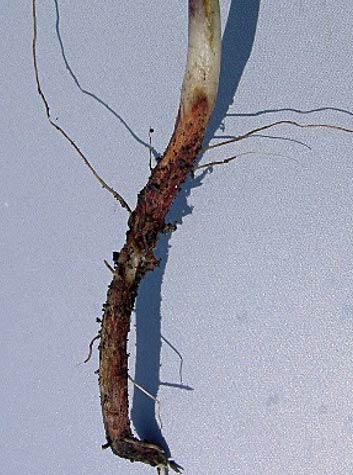 Figure 7. Red discoloration at soil line due to Rhizoctonia solani.