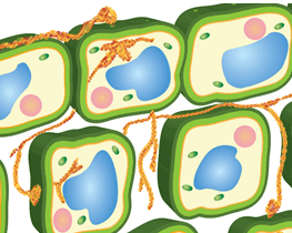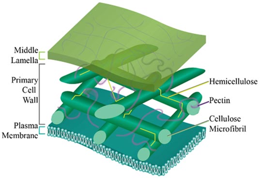 The cell passively dissuades many potential organisms from establishing, inhabiting, and infecting the plant. Cell walls are thick and can quickly activate chemical defenses at the detection of pathogens (Figure 3). Primary cell walls provide structural support with cellulose. Microfibrils are fibers made of cellulose that allow the cell to be flexible. Hemicellulose is made of cross linking glycans, which provides extra strength to the cell. Pectins act as a glue that keeps neighboring cells together while regulating water content. The combination of these components fortifies the cell. When an element is removed, the stability of the overall structure is compromised, allowing pathogen invasion.