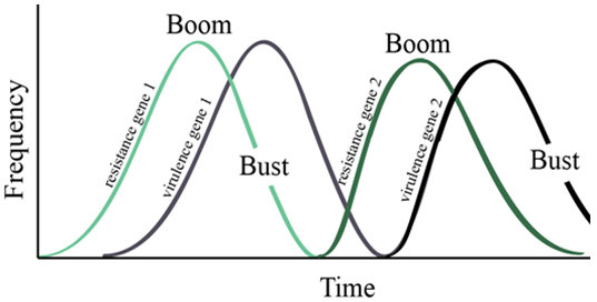 In other words, even if the plant is doing everything right, it can still fall victim to infection by a pathogen. As plants evolve more successful defenses, they increase the selection pressure on the pathogens. Therefore, the few pathogens that have the tools necessary to overcome plant defenses persist and multiply. The cycle begins anew as plants develop additional methods to counteract this. These interactions are known as boom and bust cycles (Figure 6).