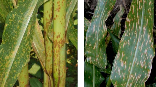 Southern rust establishes a biotrophic relationship with corn (left), whereas gray leaf spot uses a necrotrophic approach (right).