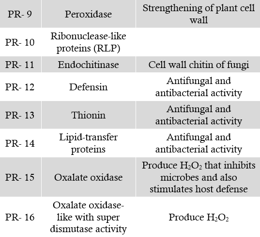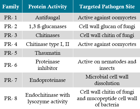 Proteins and enzymes are complex structures when compared to chemicals used in plant defense. Therefore, they are only synthesized after pathogen infections. Pathogenesis-related proteins, often called PR proteins, can be acidic or basic and incorporate varying antifungal properties. In addition, PR proteins also aid the plant when it encounters abiotic stresses. There are numerous PR proteins that have been classified, but there is still much to discover (Table 1).