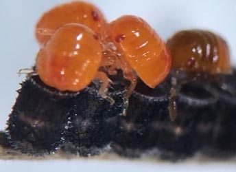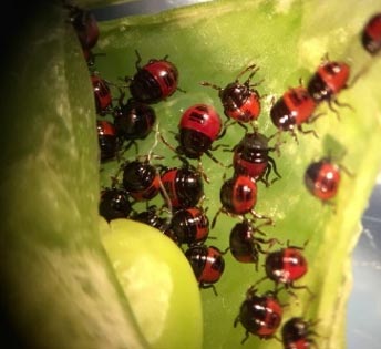 - Younger instars have black heads and pronotums. Bodies are red in color with black bands in the center of the back.