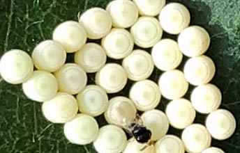 - Eggs are typically laid in tight clusters or parallel rows on pods, stems, or the underside of leaves