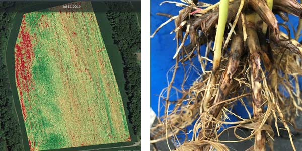 Figure 9. DroneDeploy crop health imagery in July confirmed an area of poor crop health in the field (left). Scouting revealed corn rootworm injury in this area (right).