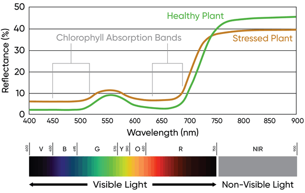 Remote sensing technology can quantify reflectance wavelengths within as well as outside of the visible light spectrum (400 to 750 nm). The wavelength bands most commonly used for measurements of vegetation are the red, green, blue, and near-infrared (NIR) bands (Figure 1). All plants have a peak in reflectance in the green band (520-600 nm). Reflectance is lowest in the blue band (450-520) and red band (630-680 nm), as these are the wavelengths absorbed for photosynthesis. The NIR band lies just outside the visible spectrum (760-900 nm) and is a very useful band for measuring plant condition. There can be substantial variation in NIR reflectance by plants. Green, healthy plants generally reflect more radiation in the NIR band than plants experiencing some sort of stress.