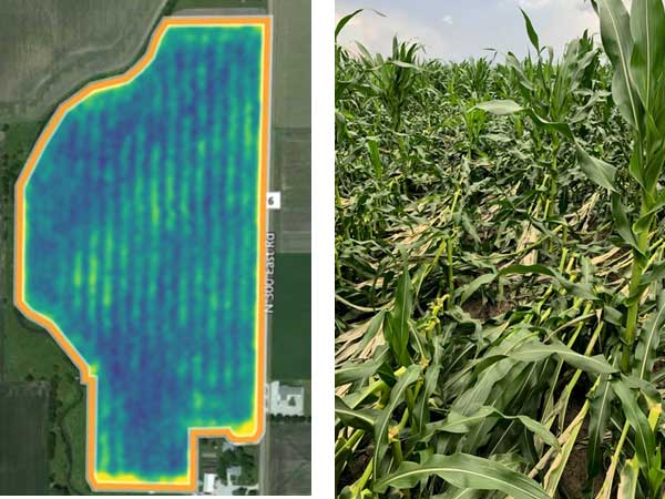 Figure 10. Granular Insights imagery showing alternating bands of reduced crop health in a field in Illinois (left) and wind damage discovered in the field (right).