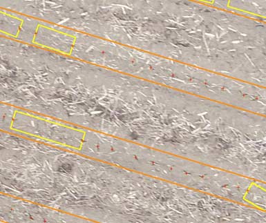 Figure 4. Corteva Agriscience image analysis software is able to detect individual plants (marked with red dots) and gaps in stand (marked with yellow boxes), providing a robust characterization of stand establishment.