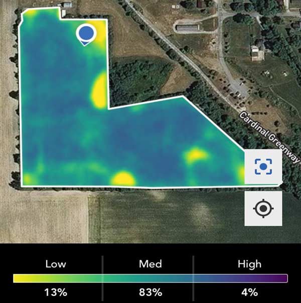 Granular Insights also provides tools to help quickly convert the intake of crop imagery into insights for scouting and crop management decisions. Imagery data is analyzed to detect changes in crop condition that suggest there may be a problem in a field that requires attention, which is then used to create Scout Prioritybeta field rankings. Users are provided weekly email notifications with a ranked list of the top fields by crop in need of scouting based on the Scout Prioritybeta score. This allows for targeted scouting without the need to manually sort through and visually inspect numerous images. The “Find Me” feature enables efficient, directed scouting by showing a GPS-enabled blue dot on the field image to track the user’s location and guide them to where the problem is in the field (Figure 2).