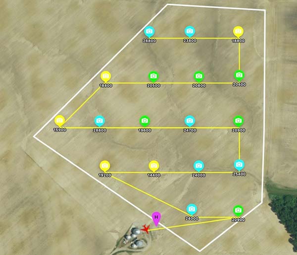 Stand evaluation using sUAS allows stand count data to be sampled from all parts of a field in a short amount of time, providing a more complete picture of overall stand establishment than can be achieved using traditional methods. A typical stand evaluation flight plan can cover an average sized field in around 10-15 minutes (Figure 5). Each sample point encompasses a sample area of around 1/10 of an acre within an image, compared to the typical sample size of 1/1000 of an acre using traditional methods.