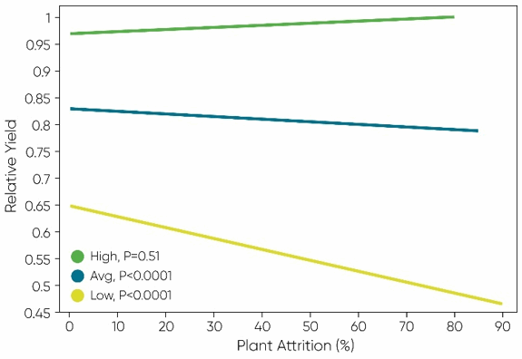 Averaged over seeding rates, the effect of plant attrition on final yield is displayed in Figure 2. At the high yield level, plant attrition does not affect yield, while a negative relationship exists for the average and to a greater extent, low yield levels. Therefore, in low yield levels, not only are higher seeding rates required to reach the AOSR, but maintaining this increased plant stand throughout the growing season is critical to maximize yield (Figure 2). The use of seed treatments, appropriate tillage and planting practices, narrow rows, and adequate fertility are all components that can minimize in season plant attrition in areas of lower productivity.
