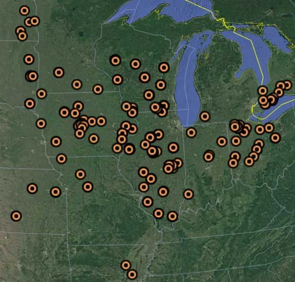 Figure 1. Location of soybean seeding rate studies from Gaspar et al. (2018).