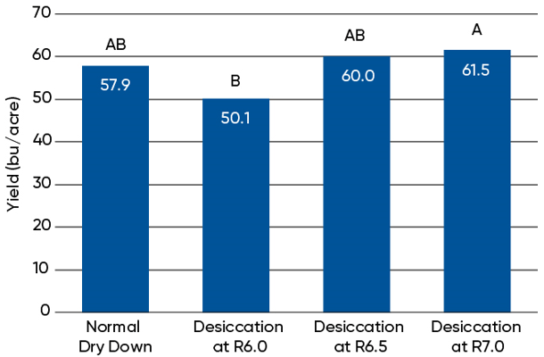 Chart - Soybean yields with normal dry down and different desiccation timings averaged across six varieties.