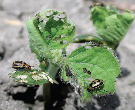 The bean leaf beetle is also a vector of several soybean viruses, including yellow cowpea mosaic, cowpea chlorotic mottle, southern bean mosaic, and bean pod mottle virus. Bean pod mottle has been identified at increasingly high levels in Illinois, Iowa and other major soybean-producing states. This virus can reduce yields 10-15%, and by much more in combination with other viruses.