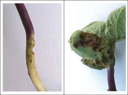 Bean pod mottle virus causes mottling and distortion of the upper soybean leaves. The crinkled leaves and stunted plants can resemble injury from herbicide drift or soybean mosaic virus. Death of new terminal leaf growth may also occur. The virus also gives rise to “green stem” symptoms in some soybean plants. Affected plants do not mature normally, and stems remain green throughout the harvest period. (However, factors other than virus are implicated in green stem syndrome as well.)