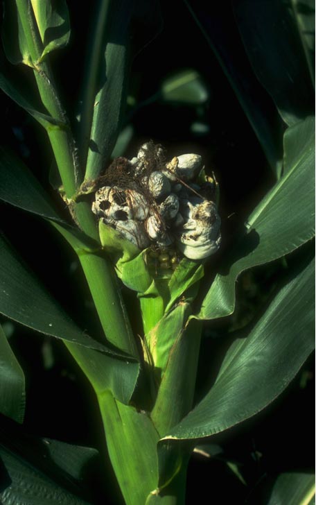 At flowering, silks may offer an entryway to the fungus if exposed for a longer period of time before pollination occurs. The fungus is capable of growing down through the silks into the developing kernels. This is often the case in very dry and hot conditions, when pollen delay occurs, or the pollen is not viable enough to ensure timely pollination and prompt separation of silks from newly formed kernels. In dry conditions it is often the tip of an ear that does not pollinate, so if those silks offer an entrance to the fungus, galls form on infected ear tips. (See Figure 5. This is characteristic of common smut but not head smut. Head smut infection typically does not allow any kernel development.)