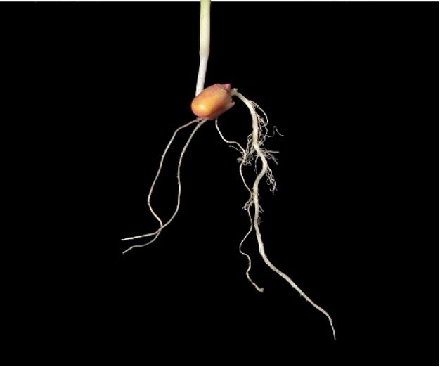 Figure 2. Corn seedling that was planted with the kernel tip angled upward, showing how both the coleoptile and radicle had to bend as they elongated to grow in the proper direction.