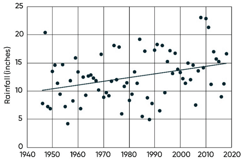 In general, warmer air is able to hold more moisture, increasing the amount of water available to fall as precipitation. In Des Moines, Iowa, for example, total rainfall between April and June has increased nearly 50% from an average of around 10 inches in 1950 to 15 inches in 2018 (Figure 3).