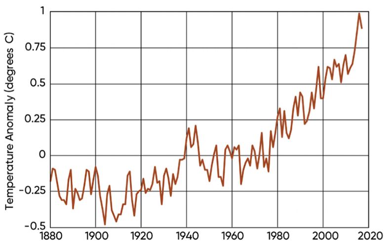 Figure 1. Annual global land and ocean temperature anomaly (deviation from 20th Century average), 1880-2018 (NOAA NCEI, 2019).