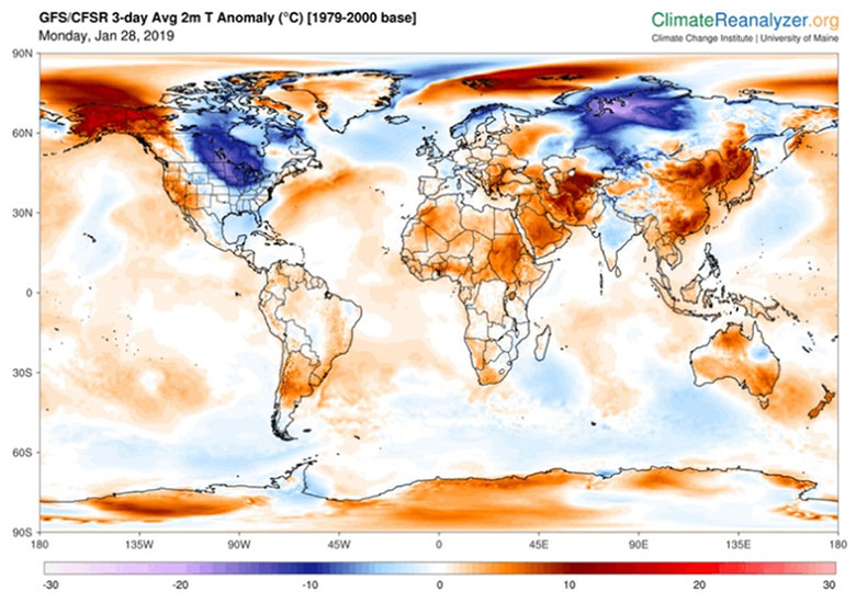 Figure 7. Average near-surface temperature anomaly for January 28-30, 2019 showing an area of extreme cold over North America. (Source: Climate Reanalyzer, Climate Change Institute, University of Maine. Data from NOAA Global Forecast System model.)