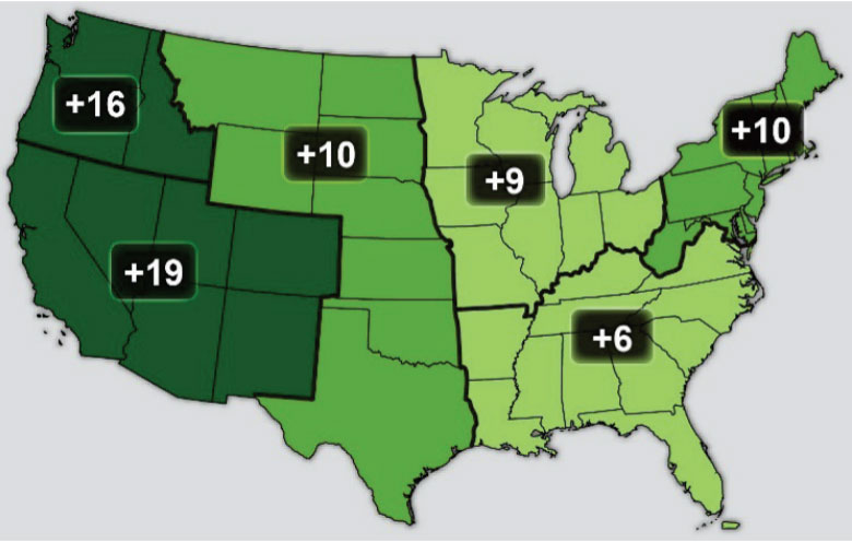 Figure 6. The frost-free season length, defined as the period between the last occurrence of 32°F in the spring and the first occurrence of 32°F in the fall, has increased in each U.S. region during 1991-2012 relative to 1901-1960. (Figure source: NOAA NCDC / CICS-NC).