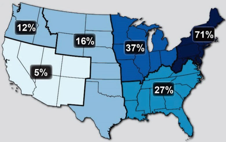 Figure 4. Percent increase in the amount of precipitation falling in very heavy events (defined as the heaviest 1% of all daily events) from 1958 to 2012 for each region of the continental United States. (Figure source: Walsh et al., 2014, updated from Karl et al., 2009.)