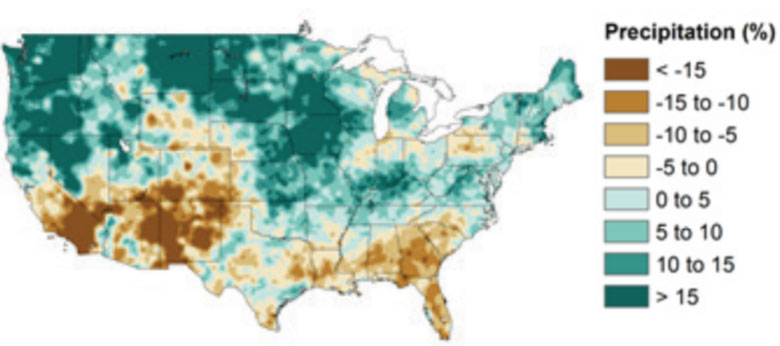 Figure 2. Change in spring precipitation from 1986-2015 compared to 1901-1960 (Figure source: Easterling et al., 2017).