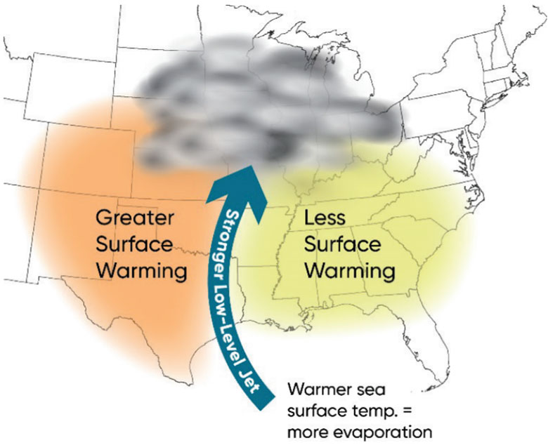 Figure 5. Warmer sea surface temperatures in the Gulf of Mexico increase water evaporation into the atmosphere. Surface warming over the Southern Great Plains increases the pressure gradient across the central U.S., which strengthens the Great Plains low-level jet, increasing the amount of moisture carried up to the Midwest that falls as precipitation.