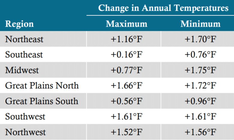 Table 1. Observed regional changes in annual average temperature from 1901-1960 to 1986-2016. Estimates are derived from the nClimDiv dataset (Vose et al., 2017).