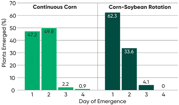 Figure 6. Percent of plants emerged by day in a Pioneer field study comparing emergence timing in a corn-soybean rotation to continuous corn.