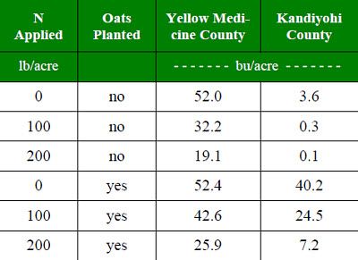 To confirm greenhouse results in a field environment, a nitrogen rate by competitive crop experiment was conducted at two locations in Minnesota. The results suggested N rate had a very negative impact on yield and the use of oats reduced the impact of nitrogen (Table 1). This was very evident at the Kandiyohi County locations. Yields were near zero when a competitive crop was not used vs. 40 bu/acre with oats planted. In these locations oats were seeded at a rate of 1 bu/acre. The oats were killed with glyphosate when they reached 12 inches in height.