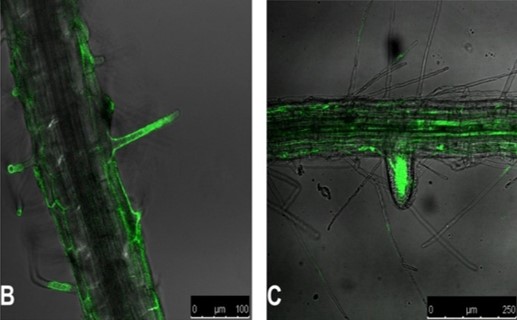 Figure 6. Roots colonized by Bacillus amyloliquefaciens (shown by green fluorescence), the active ingredient in Utrisha® P.