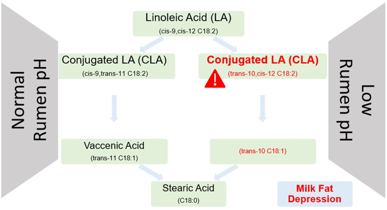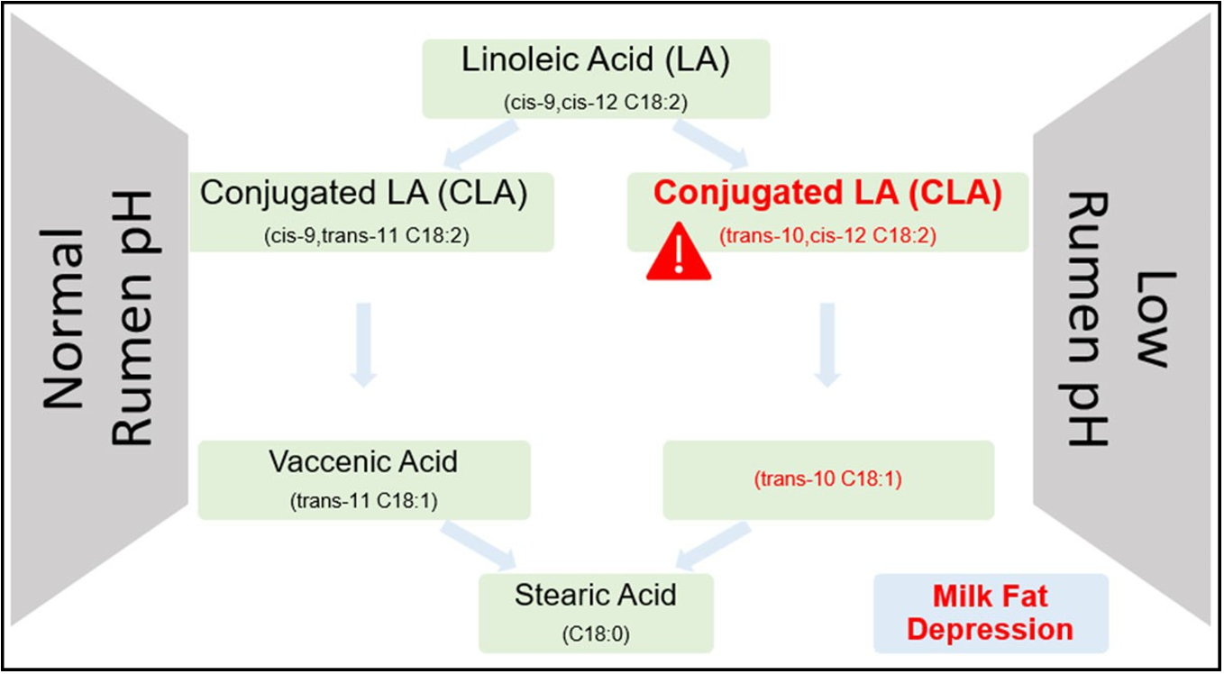 Conjugated linoleic acid (CLA) formation is part of the biohydrogenation process, but trans‐10, cis‐12 CLA formed during low ruminal pH is a potent, undesirable CLA linked to milk fat depression. Research shows that even just 3‐4 grams reaching the intestines can dramatically reduce milk fat synthesis [1].