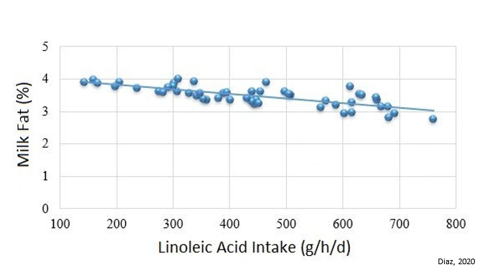 Corn silage is the primary forage choice for dairy farmers due to its high tonnage, nutritional qualities, and cost‐effectiveness. However, even though it is low in fat content, it contains a significant amount of linoleic acid. When included in large amounts, corn silage can add to the ruminal PUFA load, which has been linked to decreased milk fat percentage [2].