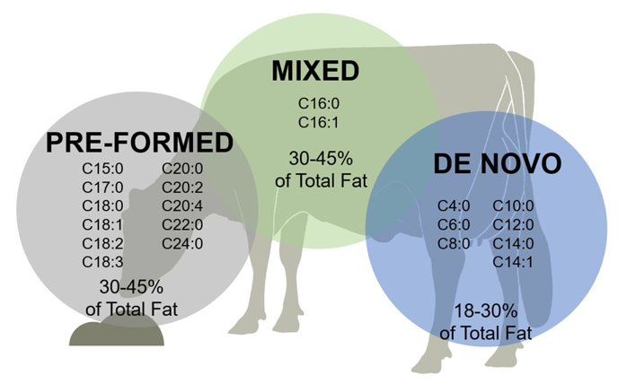 In addition, cows can synthesize fat in the udder (de novo) from simple volatile fatty acids, such as acetate and butyrate, precursors that derive from the fermentation of fiber by rumen microbes. Cows can assemble fatty acids de novo up to 16 carbons in length.