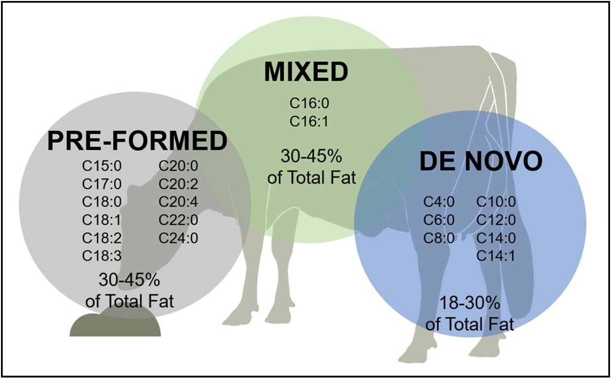 Pre‐formed fatty acids originate from mobilized reserves or from the diet. After digestion and absorption, the udder takes these fatty acids from circulation and incorporates them into milk fat.
