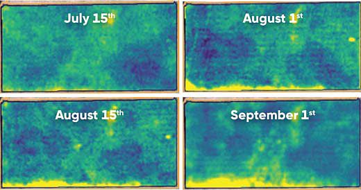 Figure 8. Sequence of Crop Health Index maps showing progression of affected area along a field edge from June 10 to September 1, 2017.