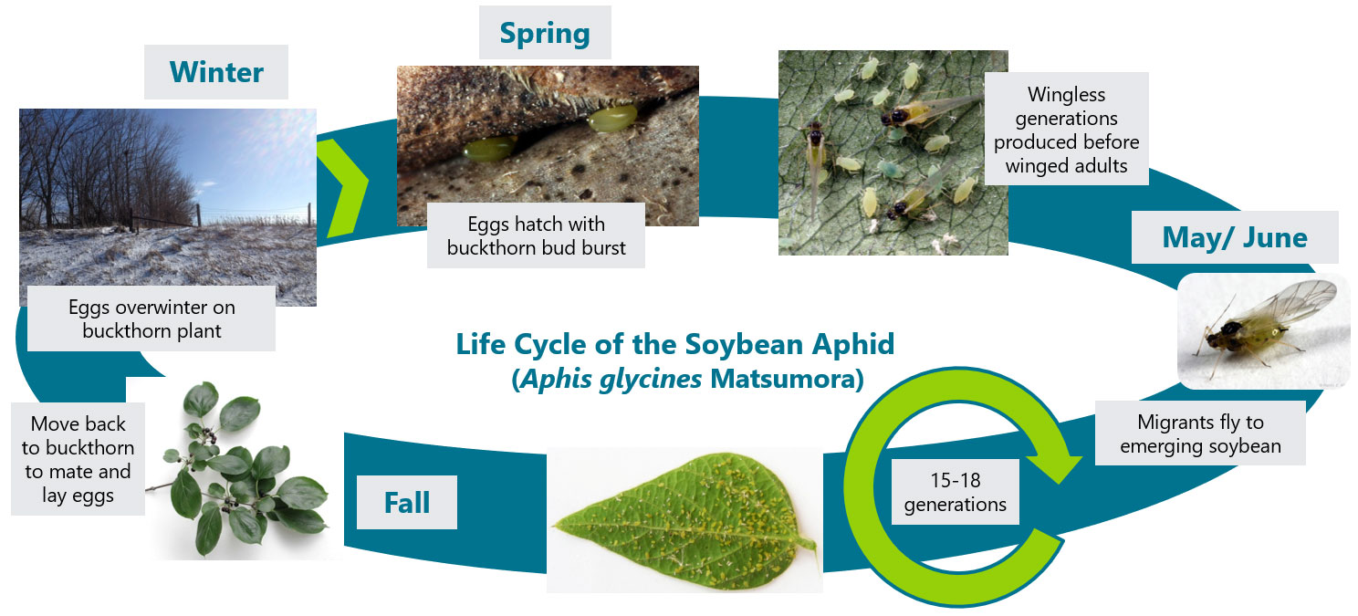 • Overwinter on buckthorn, move to soybeans in July and back to buckthorn in the fall.