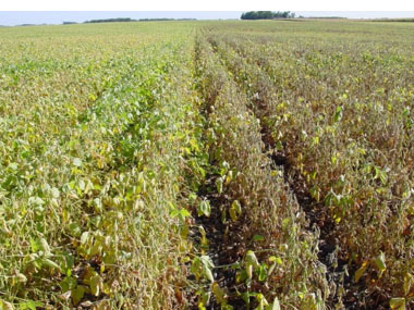 Photo - Strips of SCN-resistant and non-resistant soybean varieties in a SCN-infested field.