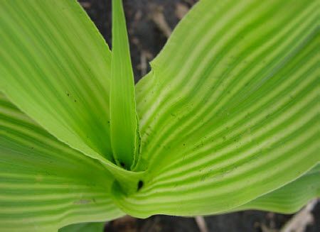 Plants deficient in sulfur will exhibit visual symptoms. Sulfur deficiency in corn can result in a general yellowing of the plant, similar to nitrogen deficiency; or as interveinal chlorosis, similar to magnesium or zinc deficiency. Sulfur is not easily translocated in plants, so symptoms will appear first and be most pronounced on the younger, upper leaves. Deficiencies of mobile nutrients, such as nitrogen, will appear first on the lower leaves as nutrients are remobilized to growing plant tissues.