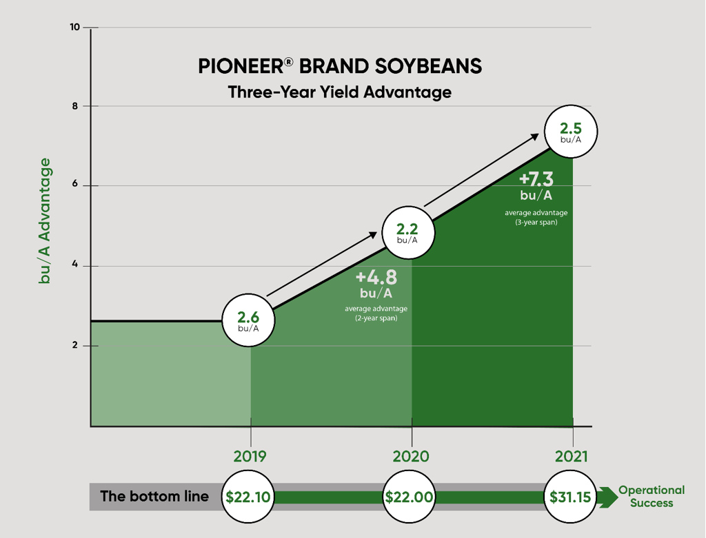 Farmers planting one of the top 40, by demand, Pioneer® brand soybean products over the last three years have seen on average a $25.08/A income advantage1 over competitive products.